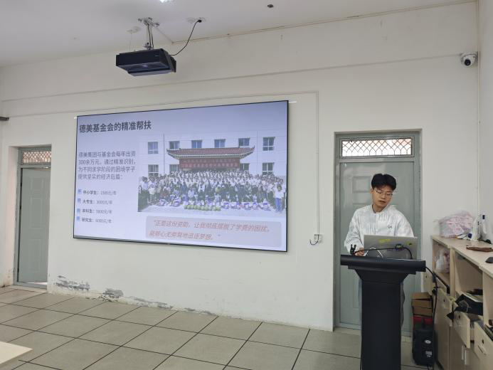 李斐斐同学结合自身求学经历,深情讲述了在家庭经济困难的情况下,得益于甘肃德美基金会的精准资助,得以安心完成学业、顺利攻读研究生的成长历程。他介绍,基金会长期面向不同学段困境学子提供稳定助学支持,以实际行动为求学路上的学子点亮希望。