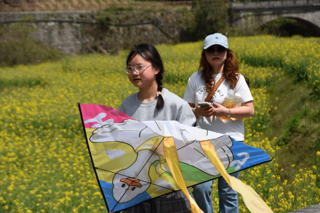 此外,大学生主播在兰草湾花田为线上观众推介亲子纸鸢放飞活动。现场展示花田开阔的风筝放飞区域,讲解风筝租赁服务、网红打卡点设置及短视频互动福利等内容,生动描绘亲子相伴、纸鸢飞舞于花海间的温馨画面,为亲子家庭提供了一份贴心的乡村踏青游玩指南。