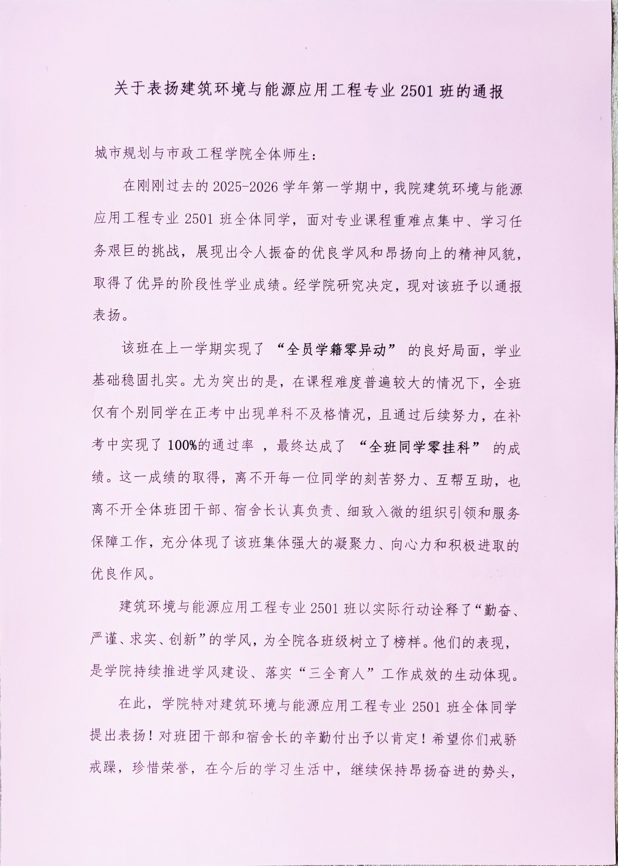 在刚刚过去的2025-2026学年第一学期中,明陞m88官方网站建筑环境与能源应用工程专业2501班全体同 学,面对专业课程重难点集中、学习任务艰巨的挑战,展现出令人振奋的优良学风和昂扬向上的精神风貌,取得了优异的阶段性学业成绩。经学院研究决定,现对该班予以通报表扬。