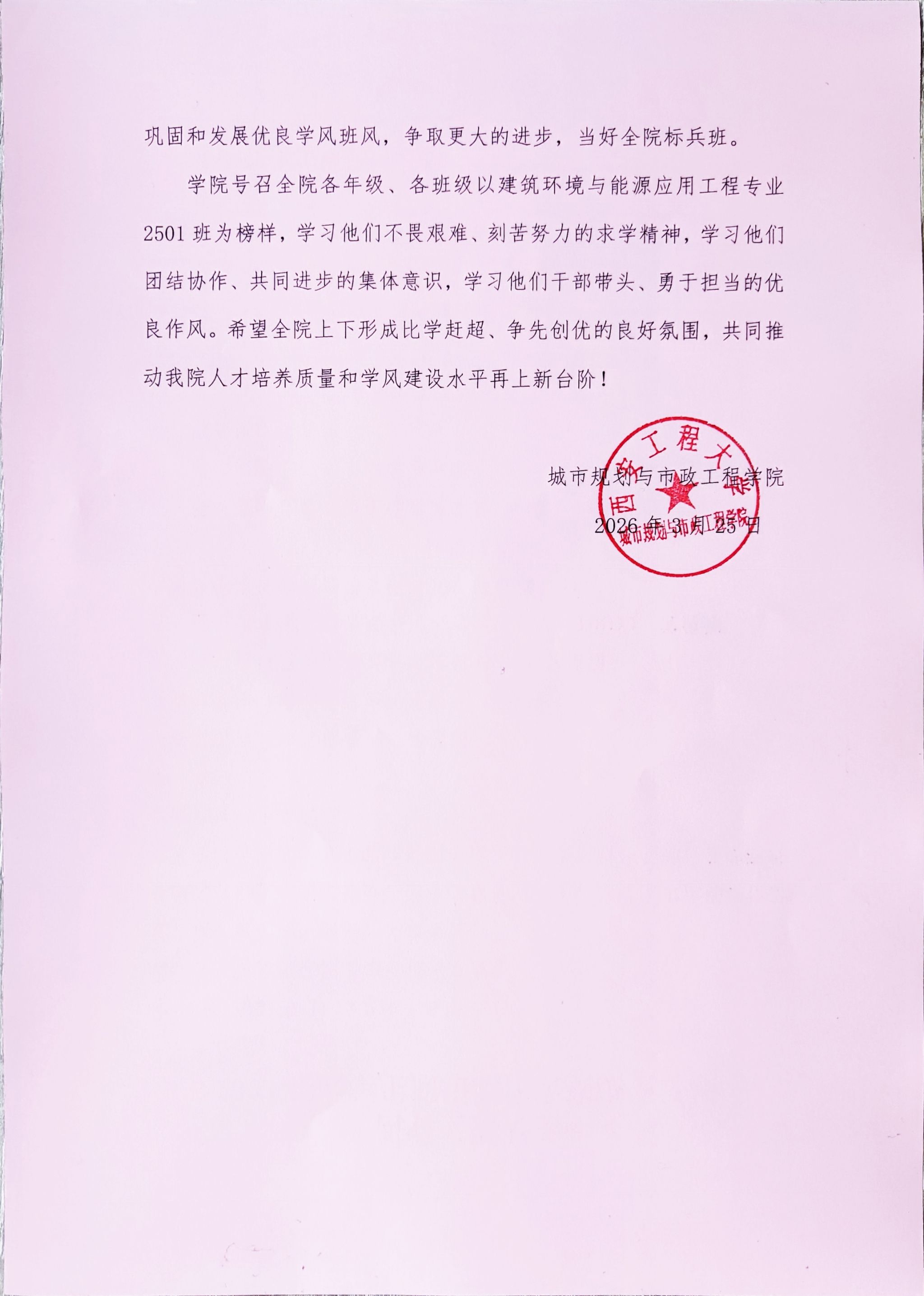学院号召全院各年级、各班级以建筑环境与能源应用工程专业2501班为榜样,学习他们不畏艰难、刻苦努力的求学精神,学习他们团结协作、共同进步的集体意识,学习他们干部带头、勇于担当的优良作风。希望全院上下形成比学赶超、争先创优的良好氛围,共同推动明陞m88官方网站人才培养质量和学风建设水平再上新台阶!