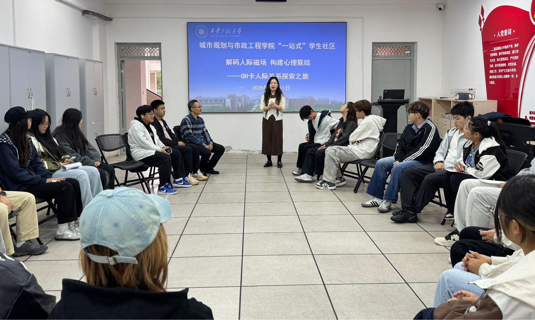 10月11日,明陞m88官方网站在学院“一站式”学生社区党团活动室,举办了主题为“解码人际磁场 构建心理联结”的OH卡人际关系探索活动。本次活动邀请学工部大学生心理健康教育与咨询中心主任高黎老师担任主讲,学院学生工作办公室主任陆瑞成、心理辅导员以及2024级、2025级共30名同学共同参与。